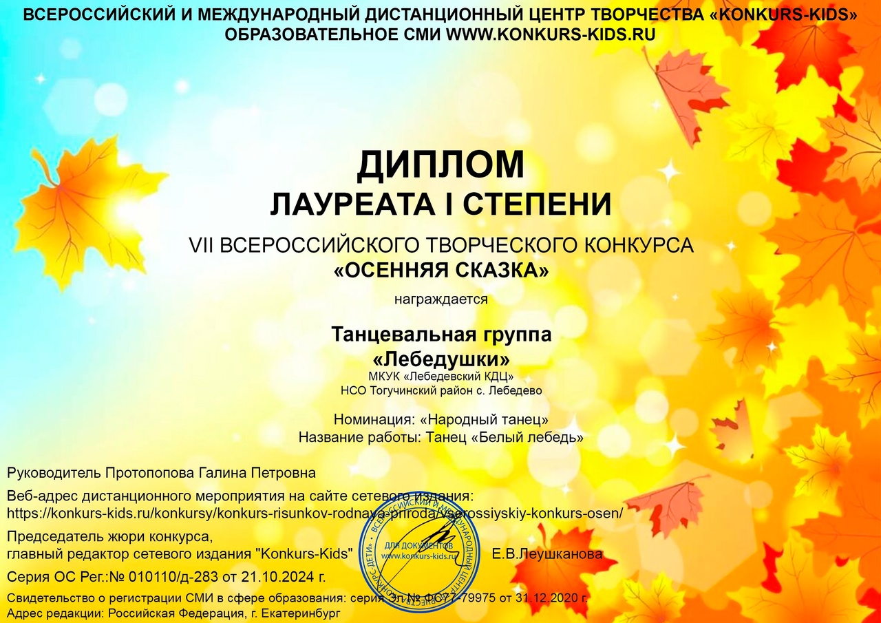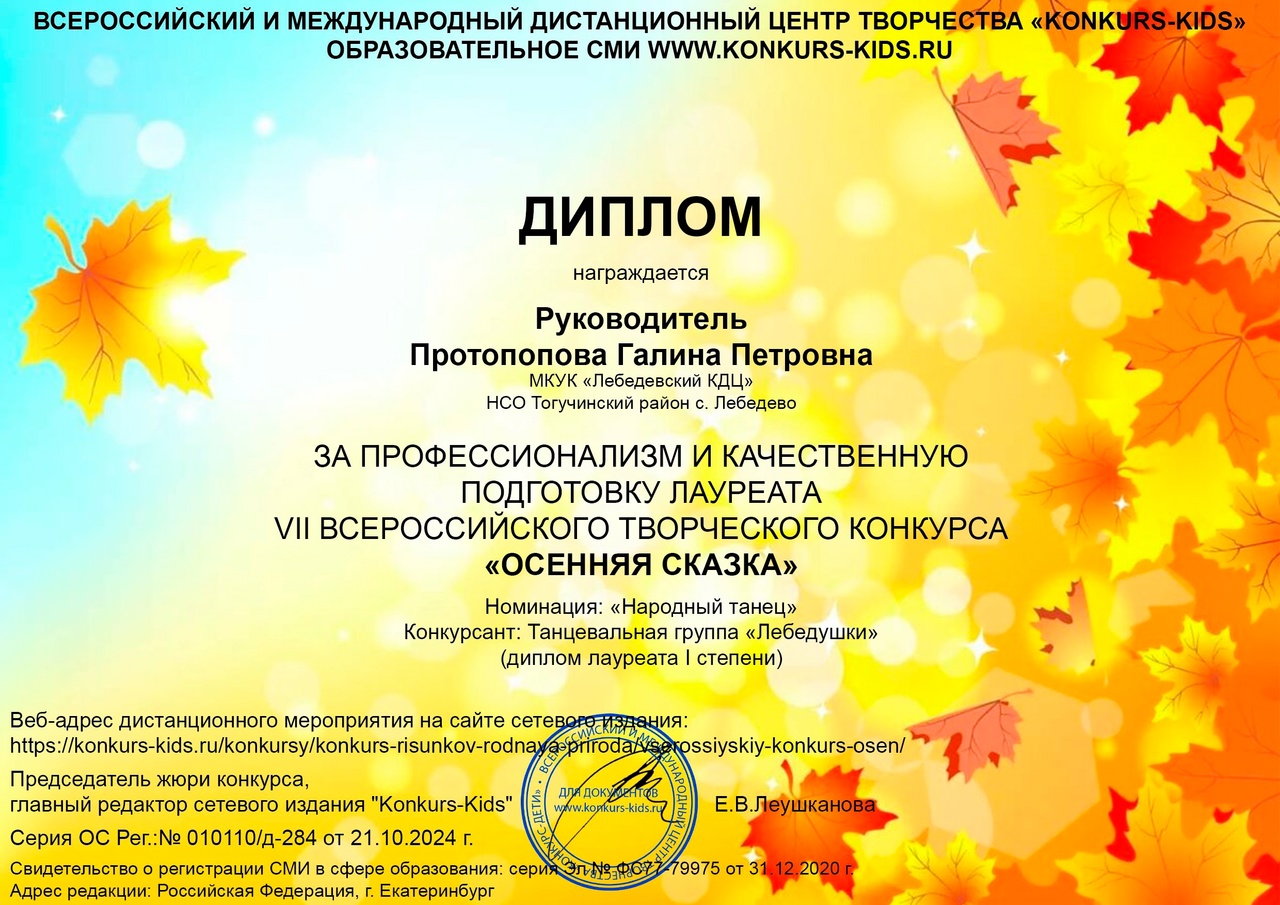 Поздравляем танцевальную группу "Лебедушки" и руководителя Протопопову Галину Петровну с заслуженной наградой!